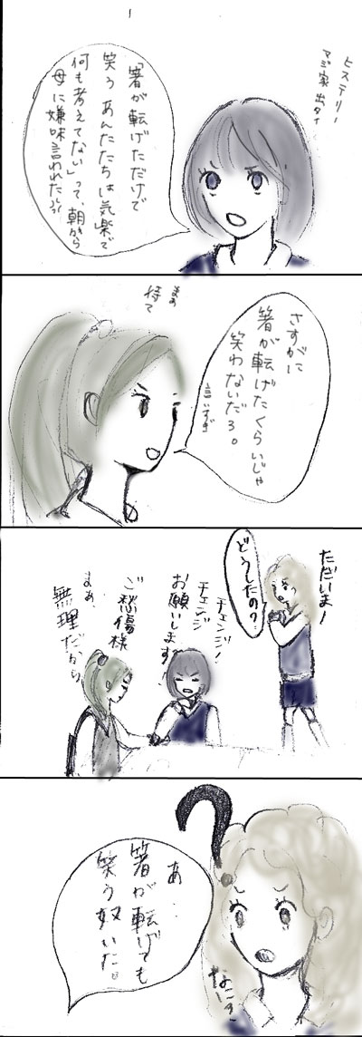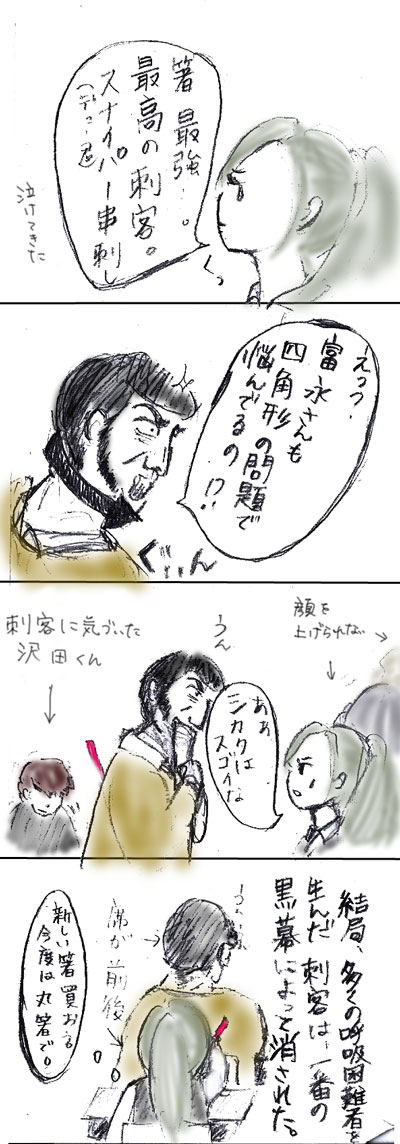 箸を投げるのは危険です。よいこのみんなはマネしないでね。(最近のテレビのテロップを意識して読み上げてください)