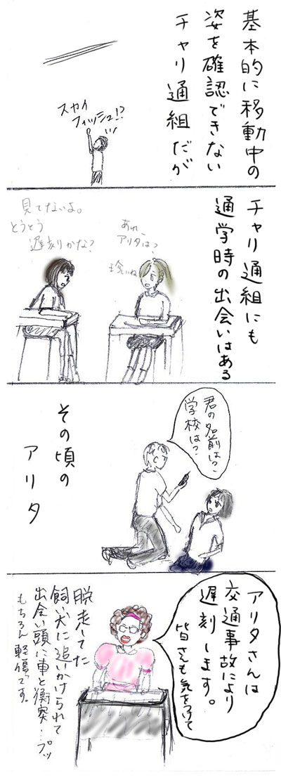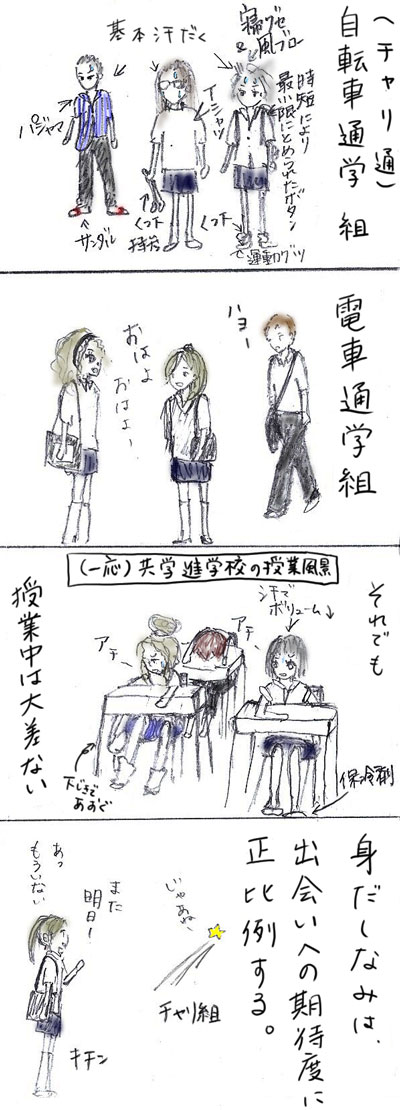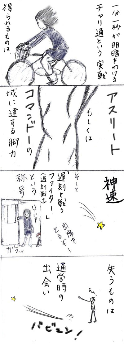私も昔、チャリ通を経験しましたが、チャリ通ほど緊迫した時間はありませんでした。入学当時はママチャリだったのが、いつの間にかロードレーサーに代わっている同級生や、制服がボスジャンやパジャマ、Tシャツなどなど時短目的のファッションに変わっていきました。