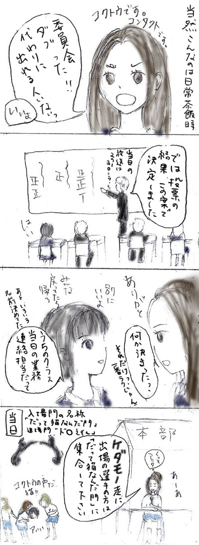 ケダモノ走は両手両足をついた状態で疾走する競技です。ほかにバック走、ネズミさんリレーなどなど、記憶に残る競技が多かったです。ちなみに徒競走はありませんでした。応援のパフォーマンスに全力を注ぐ学校だったので、競技自体にはあまり熱がこもっていなかった思い出があります。